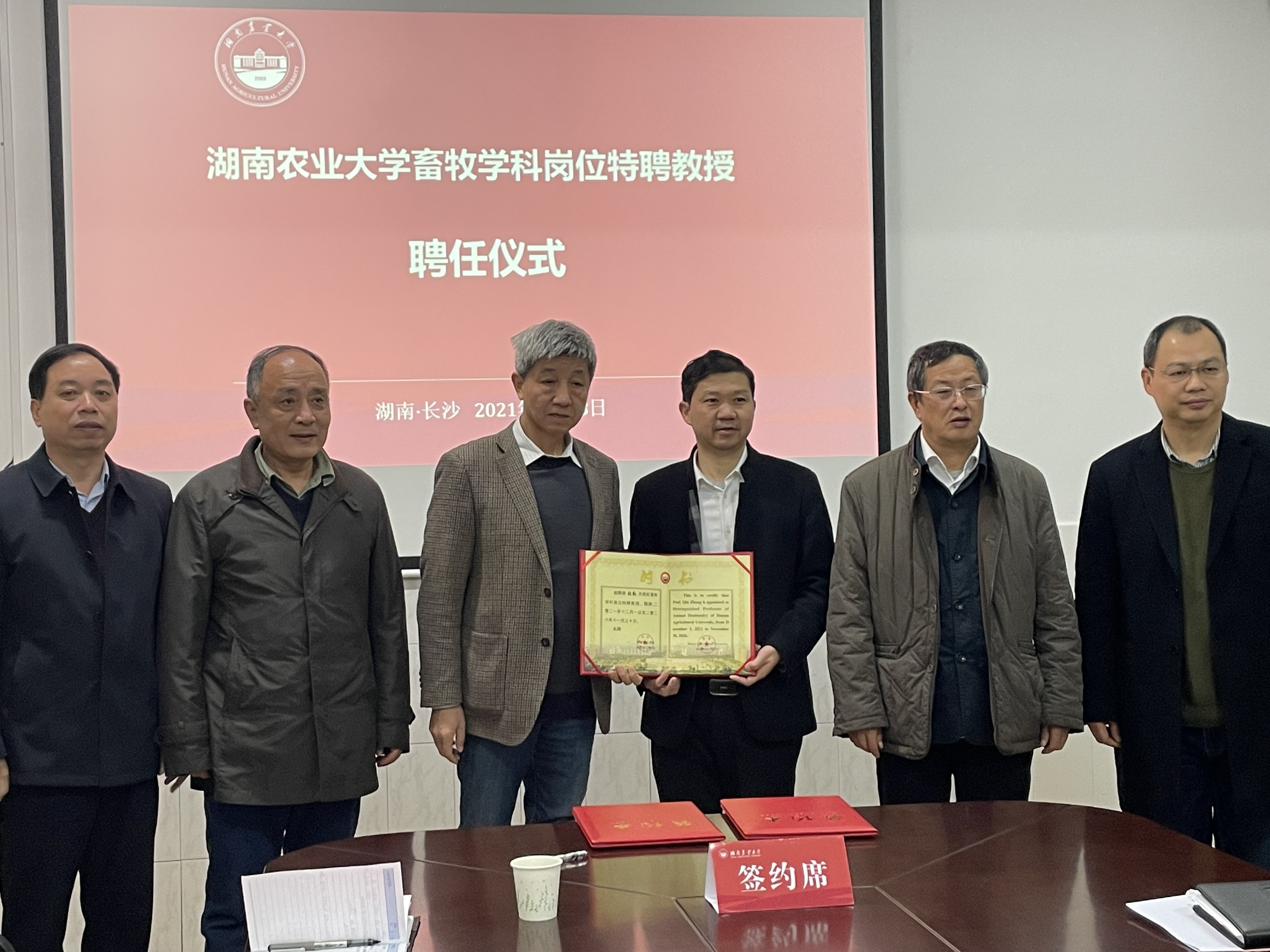 聘任仪式上贺喜院长代表德赢AC米兰官网与张勤教授签订聘任合同,人事处伍小松处长代表学校向张勤教授颁发聘书。贺喜院长介绍了张勤教授的主要业绩及学院聘任张教授的初衷,张勤教授的引进是在助推岳麓山畜禽种业创新中心建设、对接印遇龙院士动物遗传育种方向国家项目实施及加强畜牧学科动物遗传育种方向团队建设的背景下进行。