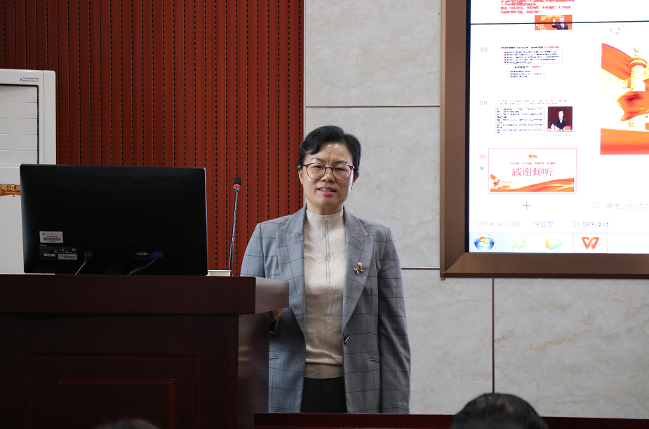 曾建英书记在总结发言中指出:伍伍小松处长的宣讲全面、系统、精准,有助于大家更好、更深入地领会理解党的二十大精神,促进理论入脑入心,更好地指导工作实践。她要求全院教职工要进一步将思想统一到党的二十大精神上来,更加坚定地捍卫“两个确立”,做到“两个维护”,坚定“四个自信”,形成“四个看齐”的政治自觉,把智慧和力量凝聚到实现学校第九次党代会制定的目标任务上来,凝聚到实现学校、学院“十四五”事业发展规划目标上来。
